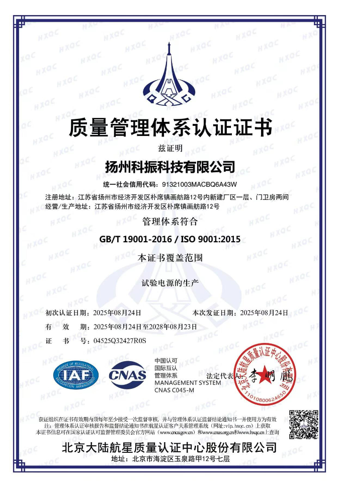 扬州科振科技有限公司是一家专注从事电源研发、生产、销售、服务一体的创新技术型企业,其产品多年来一直以高精度、高稳定性、快速响应技术为核心, 致力于为客户提供很好的测试解决方案,主要产品有大功率直流电源、高精度线性电源、交流变频电源、纹波试验电源等功率电源设备装置。科振科技是国内高精度电源测试设备生产厂家之一。经多年的研发生产能够满足市场快速发展的需要。
